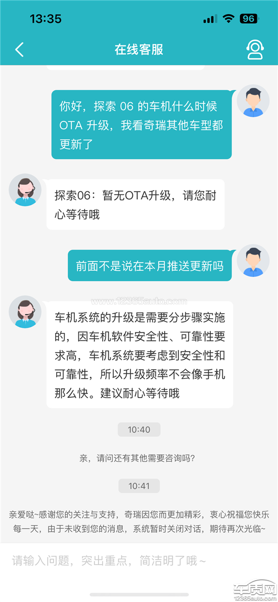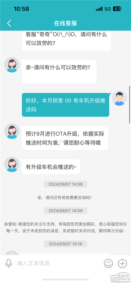 从7月份我在抖音看到有博主升级了探索06的车机,询问博主得知他是下载的测试版并会在不久后推送正式版并加了博主的探索06讨论群,博主在8月初收集群里想升级车机人员的车架号并说会在8月10号左右推送更新,然后就到了今天9月12号了,我去奇瑞app问客服车机什么时候更新的时候他们竟然说没有更新了,可是我在9月7号问的时候还说会在本月初更新呢,说话和放屁一样。