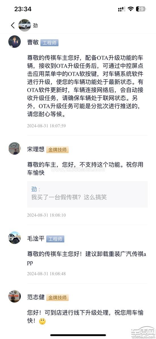 广汽传祺影酷,别人同型号就有推送,而且是上个月就收到。图片是别人的OTA,另一张图是传祺的技师问非所答。这不是在忽悠我吗?