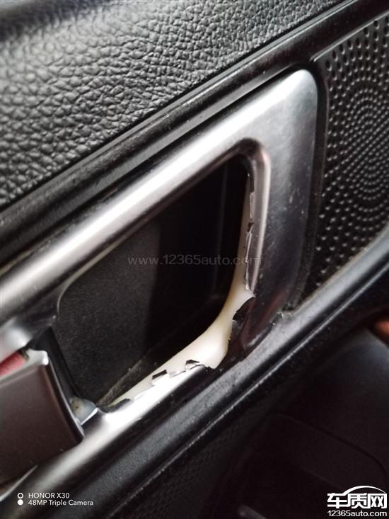 1.前挡风玻璃连接处顶棚脱落;2.门内开门扳手电镀层脱落;3.主驾气囊无故无法报警消除;4.主驾驶无钥匙进去按钮失灵。