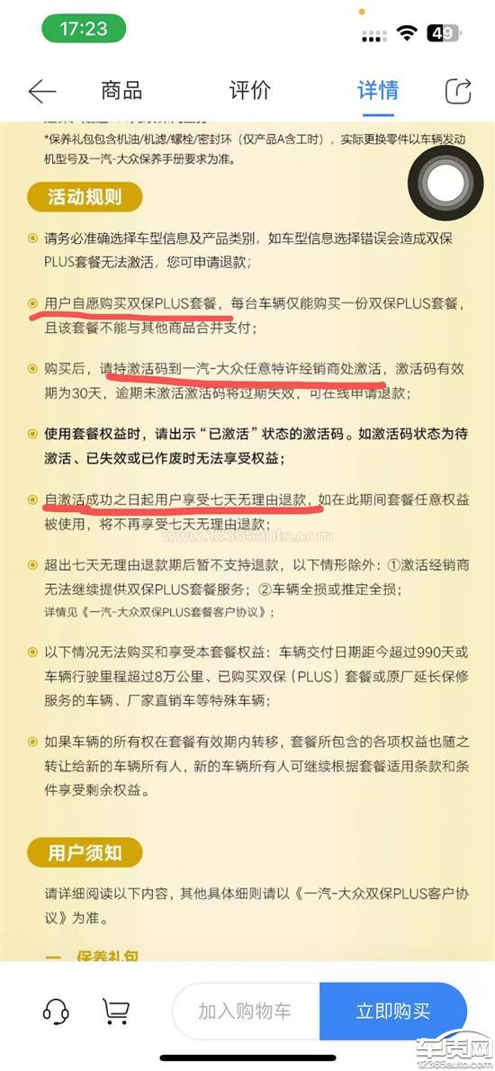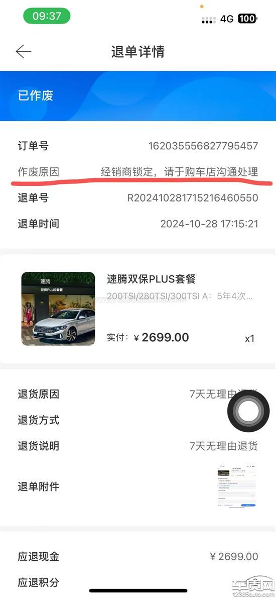 一汽大众速腾经销商强制购买双保套餐,本人未到店激活套餐;4S店未向本人获取激活码不知用何方式擅自于2024.10.27激活套餐,违反消费者权益保护法相关规定;根据双保套餐条款说明,1、用户自愿购买双保套餐而不是在购车时4s店口中说的双保必须要买!2、双保套餐条款自激活成功之日起用户享受7天无理由退款!3、本人已在一汽大众APP上申请退款,退款订单已被作废,作废理由:经销商锁定,请于购车店沟通处理,4、经和4s店协商,4s店不予退款,5、本人合理合规合法使用7天无理由退款权益,我要求退款双保费2699元。