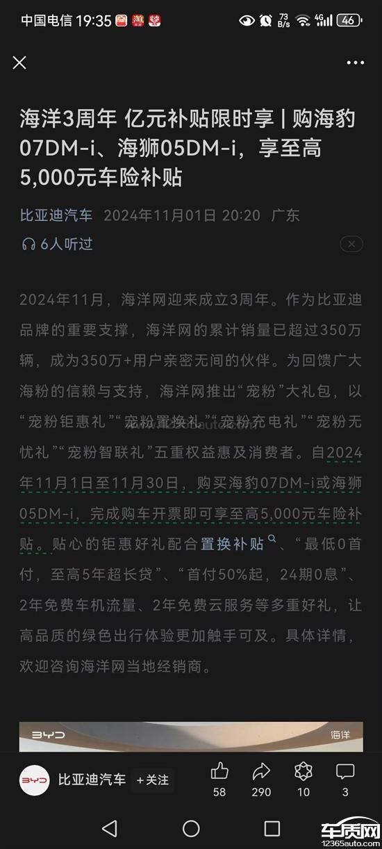我于2024年10月27到梧州比比亚迪海洋网竹湾4S店购买了比亚迪海狮05DMI75KM尊贵版,10月29号去提车上牌。11月1日,比亚迪针对海狮05所有车型推出5000元保险补贴,等于是变相降价。比亚迪海狮05车型上市才一个月。这种行为严重侵害了消费者的合法权益。之前购车的车主也应该合理享受购车补提。请保护一下消费者的合法权益,有活动有优惠应该提前告知。