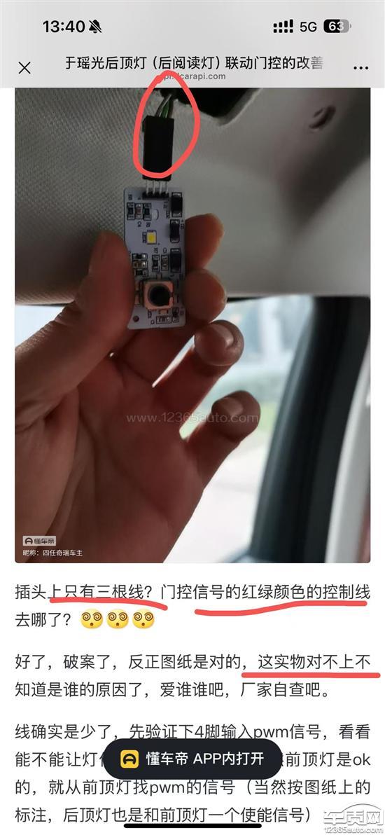 后排阅读灯不能开门自动点亮后排乘客每次都要摸黑上车,实属烦人,几万块的车都有的功能,为什么号称“豪华”“高端”的星途瑶光却没有?一直以来我都以为是硬件或者软件问题,直到前些天懂车帝论坛有车友晒出来说电路图(图一)瑶光有门控信号线,通过拆解发现这根本该有的线不翼而飞了(图二、三),而后通过杜邦线转接连到前排阅读灯最终实现了这个功能。我以为纯油瑶光车型都是这样,把这个问题在车友群说了一下,有车友说他的能解锁和开门亮灯(视频一),他的车是24年9月产的,那么问题来了,我们早批次的车活该少一根线?通过询问买车4S店售后了解到,这个问题不单单瑶光,早批次的凌云,揽月也有这个问题(图四),那么这个就是普遍存在的生产缺陷,希望厂家予以解决。