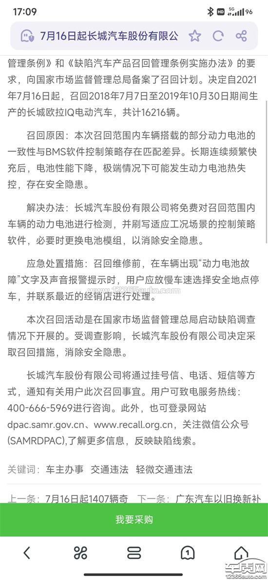 该车是长城欧拉IQ召回车辆,车辆仅行驶200,000公里左右,电池就已达到报废标准,严重影响车辆的正常使用和价值。然而长城欧拉召回方案是刷写升级软件,是我们车主不能接受的,原本充电速度及充电功率能够达到150A左右、功率约55kW,刷写升级软件后充电电流被控制在50A左右,充电时间大幅延长。在召回方案中提及的更换电池模组,然而并没有更换电池包一说。根据本地其他欧拉IQ车主,在达到公里里程200000左右,续航只有150-180,电池包鼓包,长城欧拉才给予更换电池。事实,我车现在行驶到216551公里,出现了动力电池故障及续航里程严重不足,长城欧拉不给予召回车辆更换电池模组。
