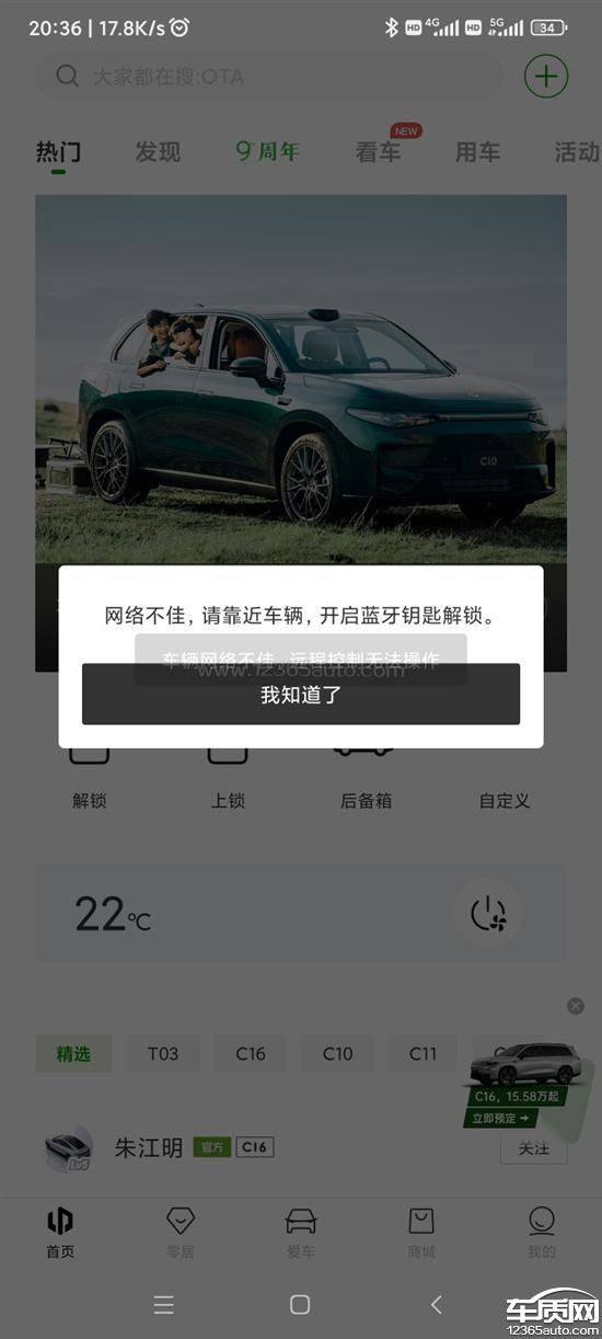 车辆停放在市中心,周围空旷,未停放在地库、建筑内等可能导致信号差的地方,且手机网络正常,但车机网络无法连接,导致APP无法进行车辆解锁。联系客服重置车机网络后仍无法解决。