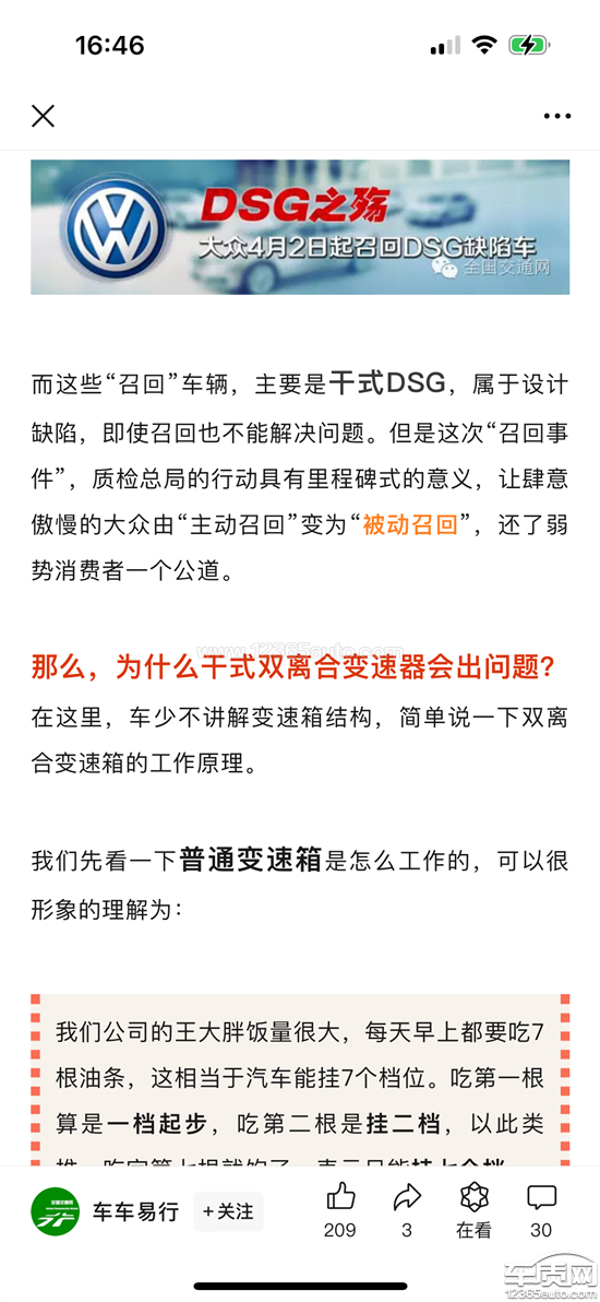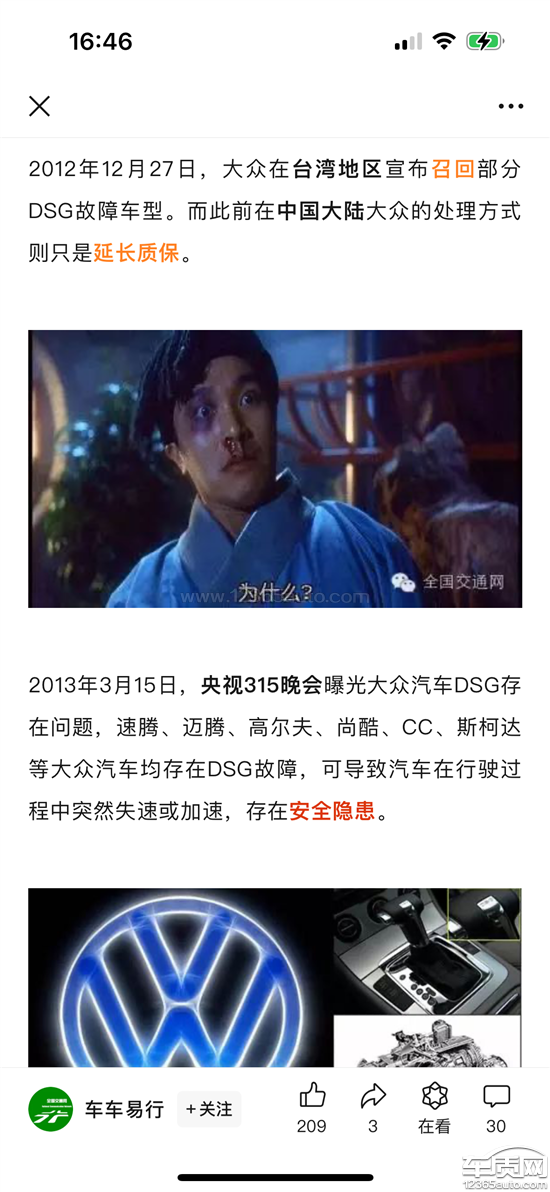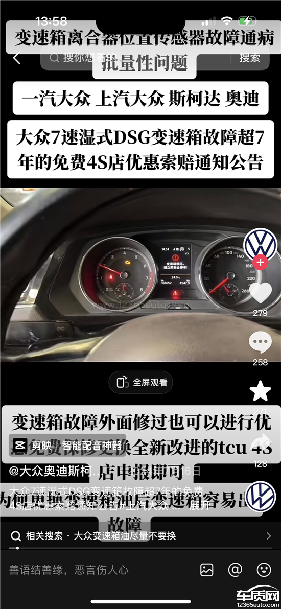 车辆在行驶过程中,多次发生失速,显示变速箱故障,险些发生碰撞,非常危险,故障码为P084100,根据资料显示,该款车的DQ200,干式双离合变速箱,早在2013年就被315晚会曝光了质量缺陷和设计缺陷,属于质量通病,并且在2013年被国家质检总局责令召回,明显说明是批量质量问题,该厂家当时也出台了相应的质保措施,我找经销商协商,经销商以车辆过保为由让我自费,算出来1万多.又跟他们协商给予优惠索赔,也不予理睬,现诉求如下:厂商或经销商免费维修更换问题部件,不要规避责任,不要寒了该品牌车主的心,导致在后续购车对该品牌车型避之不及。