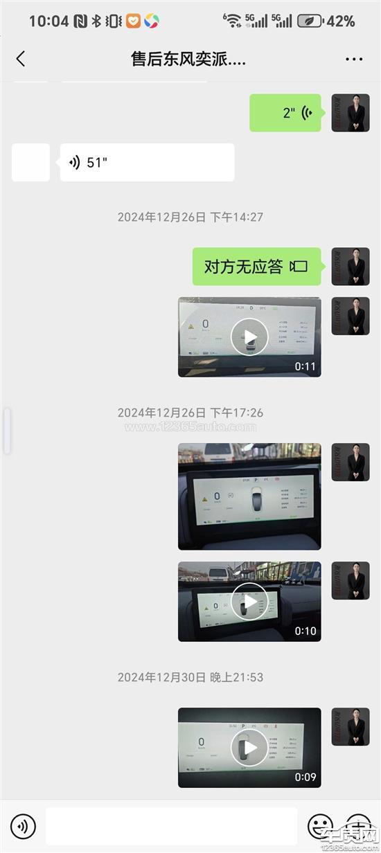 东风乘用车厂家回复:客户反馈的问题厂家已知晓并高度重视,已安排相关4S店和客户进行对接,正在积极的沟通处理中。厂家也将持续关注后续处理结果,感谢客户的支持与谅解。东风Eπ客户服务中心:4006000666/8008840000