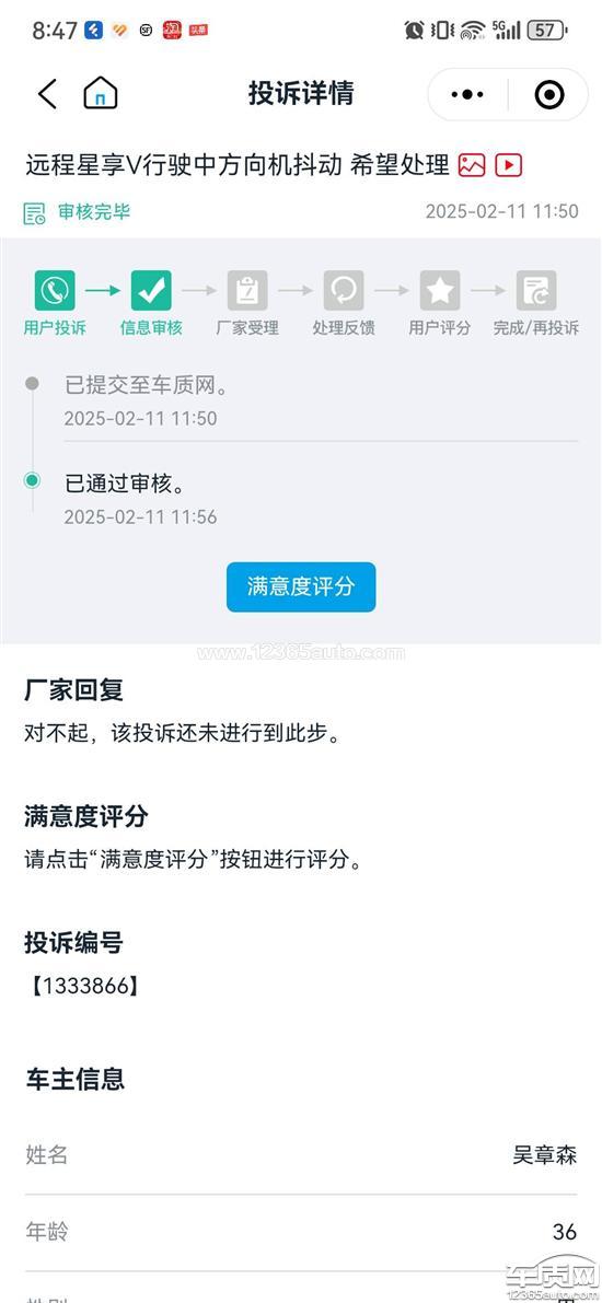 在2月11日投诉远程方向机质量问题后,车质网平台工作人员来电了解情况后,投诉通过审核反馈厂家。中间服务站打了个电话,加了微信到目前就没消息了,我想问这就是厂家的态度和处理方式吗?