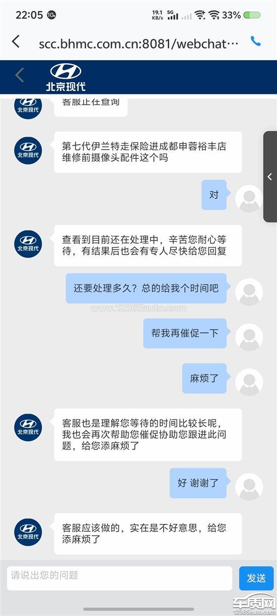 北京现代厂家回复:尊敬的用户:您好,您反馈的问题已同步给成都申蓉裕丰店,特约店会尽快安排工作人员与您沟通,请您手机保持畅通,厂家也会协助特约店处理您的问题。后期如有需要,欢迎您致电北京现代官方服务热线400-800-1100。