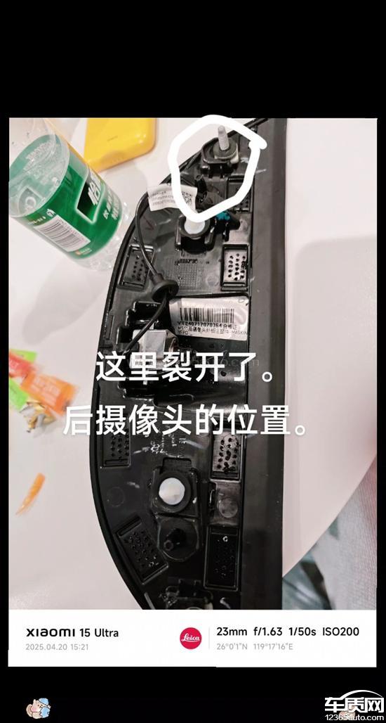 小米SU7后摄像头内部螺丝部位开裂导致漏水,意外发现车内湿湿的有漏水痕迹。检查后是后摄像头内部螺丝部位开裂,现怀疑是出厂品控有问题,漏水导致车辆安全问题,没得到妥善解决!希望有关部门重视车辆的质量问题。
