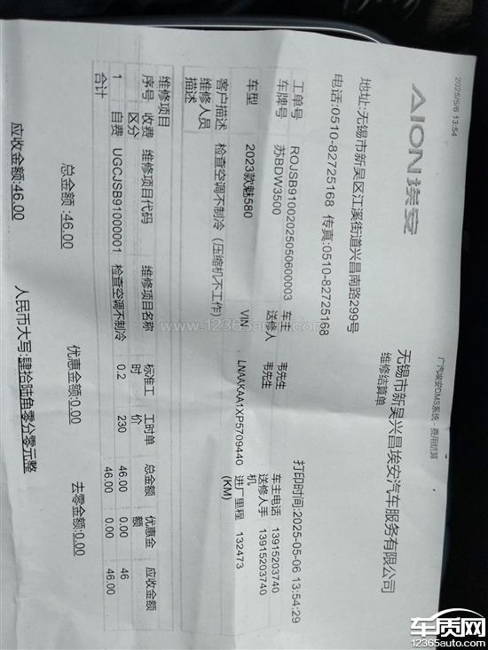 埃安厂家回复:感谢您选择埃安,您的信息我们已经收到,会安排当地经销店核实处理,后续您有疑问拨打埃安客服专线:400-188-3333,或者通过埃安APP专属服务群跟我们反映,我们将竭诚为您服务。