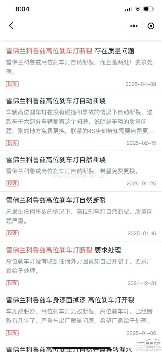 我要投诉上汽通用雪佛兰。科鲁兹,迈锐宝,别克君威都有高位刹车灯断裂,这是上汽通用质量问题而且是通病,以前迈锐宝还有召回维修更换的,为什么科鲁兹没有召回维修呢?难道说该车型停产了,就不管它的死活了吗?请雪佛兰厂家给我个合理解释。我的车基本都放在车库,从购买车到现在也才开了26000左右公里数。我可以保证我的车高位刹车灯断裂不是行驶过程中断的,是停放在车库发生的断裂,这个配件属于生产质量问题,车质网图片投诉科鲁兹全是出现高位刹车灯断裂,我这边要求厂家4s店召回科鲁兹到店进行免费更换。