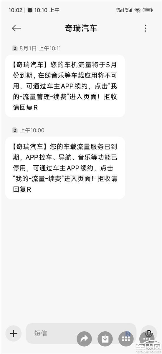 奇瑞汽车厂家回复:“接到贵网反馈的客户信息后,我司非常重视:已及时联系客户解释清楚:因此条短信提醒的是娱乐流量到期的提醒,非基础流量,经核实您的基础流量首任车主是终身免费的,详情可在我的续费里面查询流量情况;我司会继续做好对该车的跟踪服务,为客户提供周到的售后服务和保障。同时也非常感谢客户对奇瑞汽车的关注和支持,衷心祝您生活愉快,工作顺利!“
