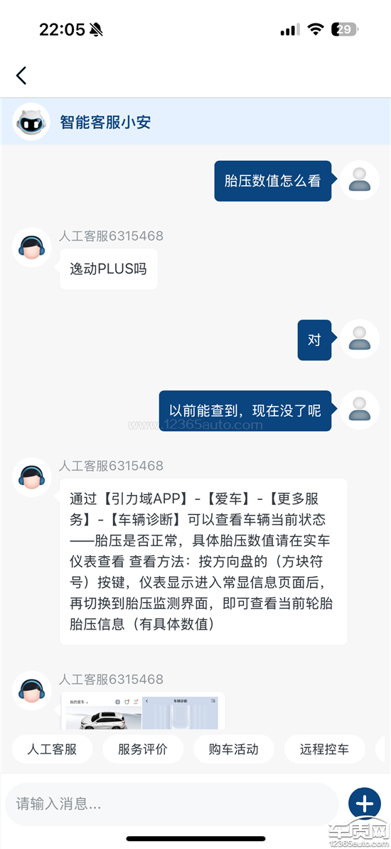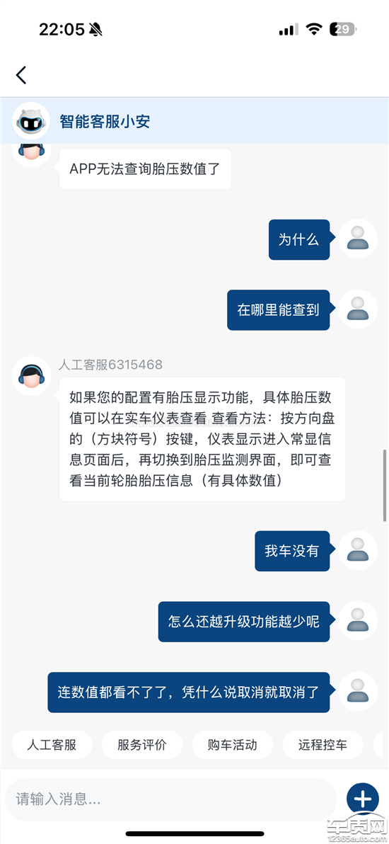 车辆APP以前能查到胎压数值现在查不到了,APP功能随意删减,最重要的胎压数值检测竟然被删掉了,客服回应的理直气壮说就是删掉了没有任何理由。