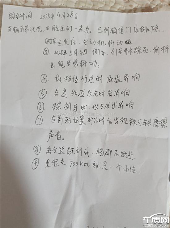 车辆质量存在各种问题,把车辆问题已按照图片6中格式跟所在地售后反馈,同时拨打了厂家电话,当地售后于2025年6月10号把车开去,11号开回来,说没有问题,还叫我不要拨打厂家电话,于是我拨打了厂家电话,说售后没检测出来,我说,当地售后检测不出来,我肯请厂家派人来解决问题,如果厂家不派人来解决问题,我就要求第三方检测,厂家于6月12号打电话给我说,走第三方检测,所有费用由我承担。