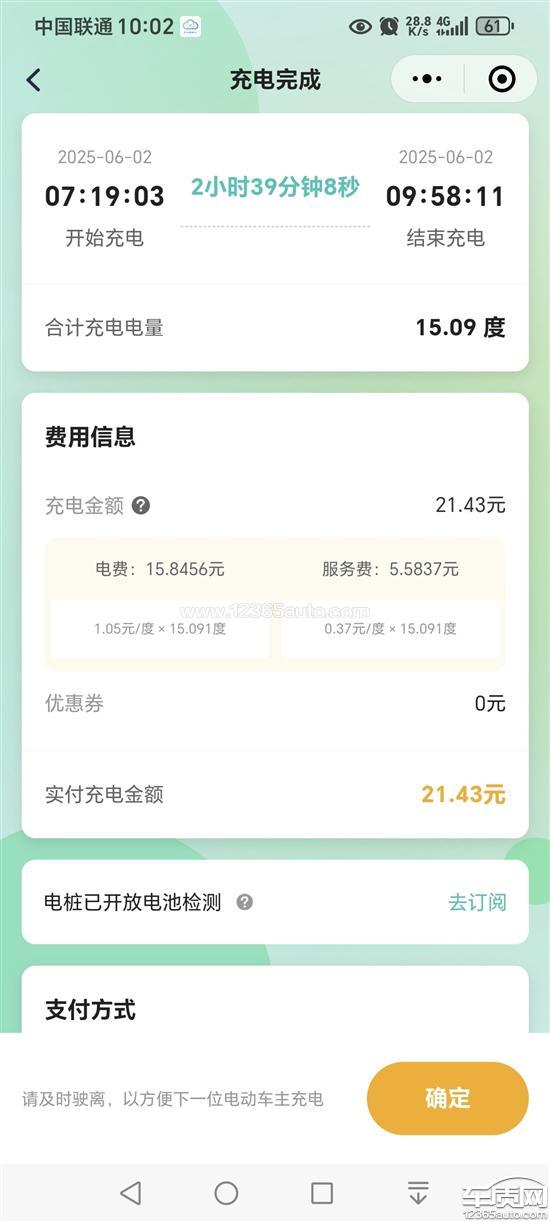 电池19.27度电,只能冲进去15度电。买车到现在就没有充进去19.27度电,就不说19.27,哪怕18度,也可以。厂家回复:(我们厂家回复了,表示你这个是电池的正常耗损,就跟手机电池一样,电池时间长了电会有不经用的情况)。这个我不认可,因为买车到现在就没有充进去这么多。
