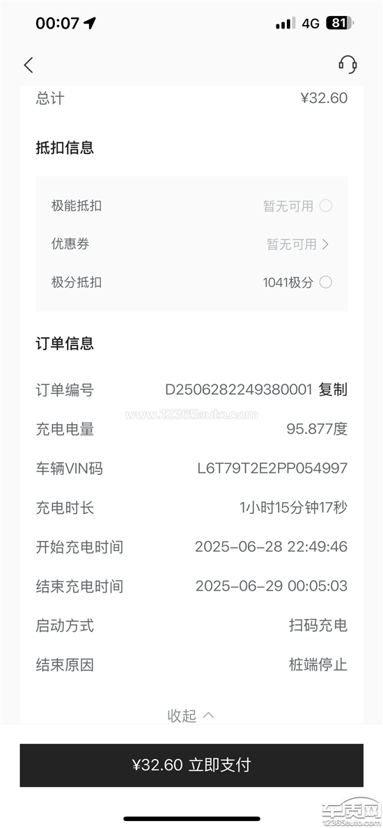 最近半年来我一直怀疑我的车被锁电了,这次我把车电池充到99%,然后放电跑到电池百分比失去显示,也没有标显里程,一共显示用了86.4度电;然后我立刻就去极氪官方极充桩上充到100%,桩上一共显示充了95.877度电,这里面还包括损耗。