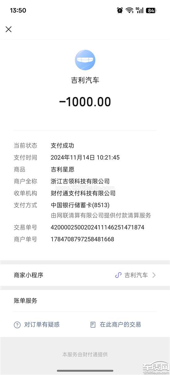 本人于2024年11月14日在吉利app上支付1000元定金,下单吉利星愿,当时承诺订单到期后180自动退款,目前距离订车已过去8个月,多次联系4s人员无果仍未退款。