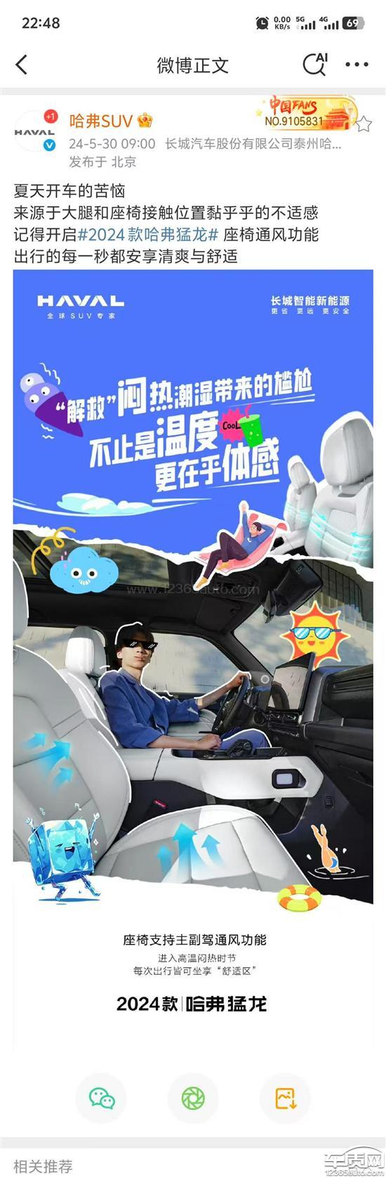 投诉!哈弗的官方app宣传页,微博官方账号宣传图,还有配置单上全部写的有座椅通风,而且宣传图上也标记了座椅的靠背通风功能!而实际上却只有坐垫通风,靠背根本没有通风功能!是用的残次品,缩水配置!我冬天买的车,之前没注意到这个问题,夏天到了,背部热出汗热的要死!虚假宣传骗人有座椅通风!