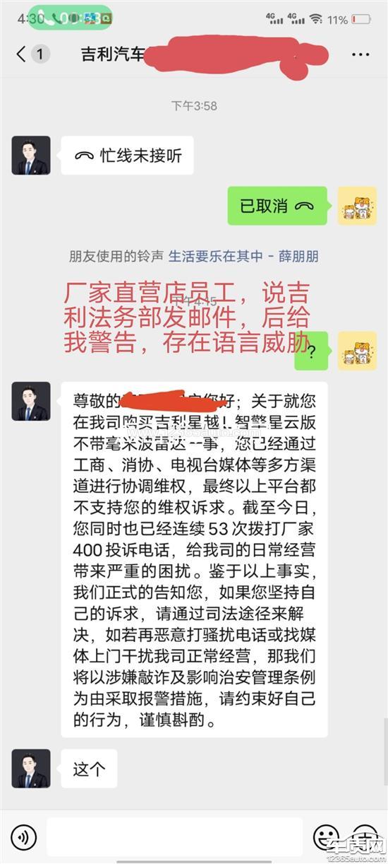 吉利汽车厂家回复:您的信息我们已经收到,将尽快协调相关4S店与您核实处理,同时请保持手机及其它设备畅通,方便工作人员与您联系,厂家也将持续关注后续处理情况。感谢您的支持与谅解,如有疑问欢迎您致电吉利汽车客户服务热线:400-886-9888。