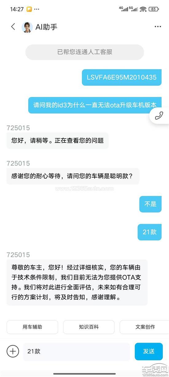 上汽大众在旗下ID系列车型发售之初宣称该车车车型具备OTA(空中下载技术)功能。车子从2023年10月在4S线下升级过后,至今没有被OTA升级,而同款车型旧已经有最新软件版本,询问客服被告知由于技术条件限制,无法提供OTA支持,需要到线下4S店进行刷机升级,而到线下4S店又以过保为由,需要车主自费掏980元进行升级。这本是汽车企业的技术限制导致无法OTA,为什么费用要转嫁给车主承担?诉求:上汽大众推送升级工单到线下4S门店进行免费升级。
