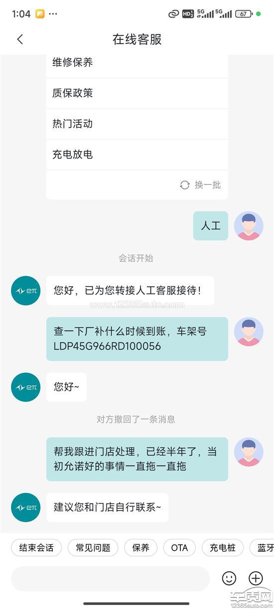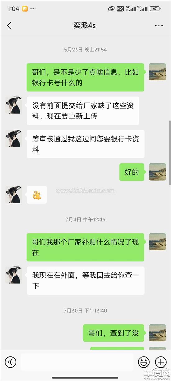 3月31日份买的车,买车时销售承诺有厂家置换补贴8000元,包括东风奕派app的交车权益里面也有此内容,关于补贴兑现方面,咨询厂家后,厂家将补贴兑现的责任推诿给4s店,4s店在买车后的两个月虽然主动联系我关于厂补落实的事情,但是已经截至目前也没有任何消息,4s店的工作人员对补贴兑现的时间出尔反尔,现在已经不回复微信了。