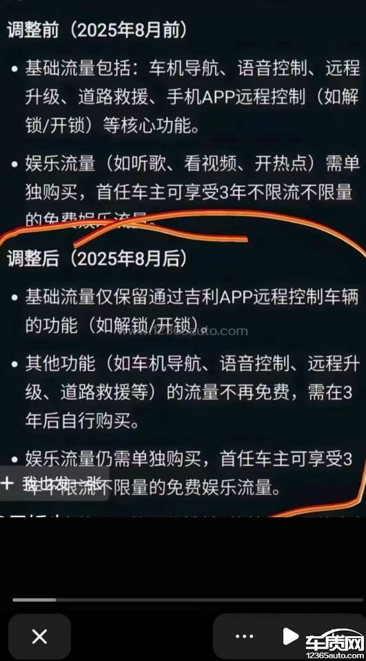 买车时说车机流量分为基础流量和娱乐流量,车其中基础流量包含地图导航、软件升级、远程质控制、道路救援、智能语音、数据同步上报等网基础服务;娱乐流量包括在线音乐、在线视频、在线电台、WiFi热点等娱乐服务;现在说车机流量分为基础流量和娱乐流量,其中基础流量仅包含远程控制,其它均为娱乐流量。私自变更基础流量内容。购车时承诺的基础流量范围如今被私自篡改,车要求调整恢复原来承诺的政策。