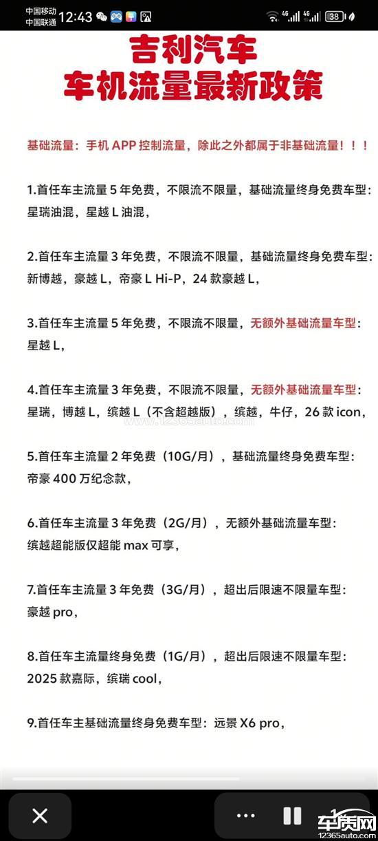 吉利汽车厂家回复:对于3年/5年不限流不限量的套餐,首任车主在套餐到期后继续享有的基础流量主要包括:车辆远程控制、在线导航、语音助手、天气服务、OTA升级,具体实际支持的功能以您的实车配置为准。
