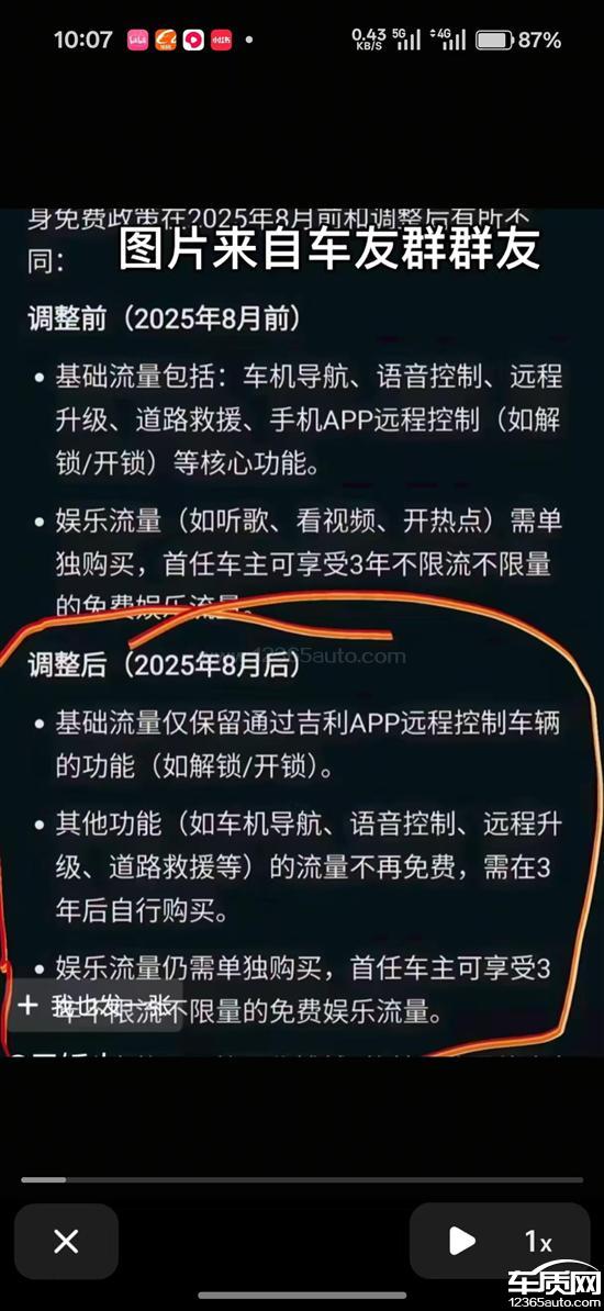身免费政策在2025年8月前和调整后有所不同:调整前(2025年8月前)基础流量包括:车机导航、语音控制、远程升级、道路救援、手机APP远程控制(如解锁/开锁)等核心功能。娱乐流量(如听歌、看视频、开热点)需单独购买,首任车主可享受3年不限流不限量的调整后(2025年8月后)基础流量仅保留通过吉利APP远程控制车辆的功能(如解锁/开锁)。其他功能(如车机导航、语音控制、远程升级、道路救援等)的流量不再免费,需在3年后自行购买。娱乐流量仍需单独购买,首任车主可享受3+我也娘洲不限量的免费娱乐流量。
