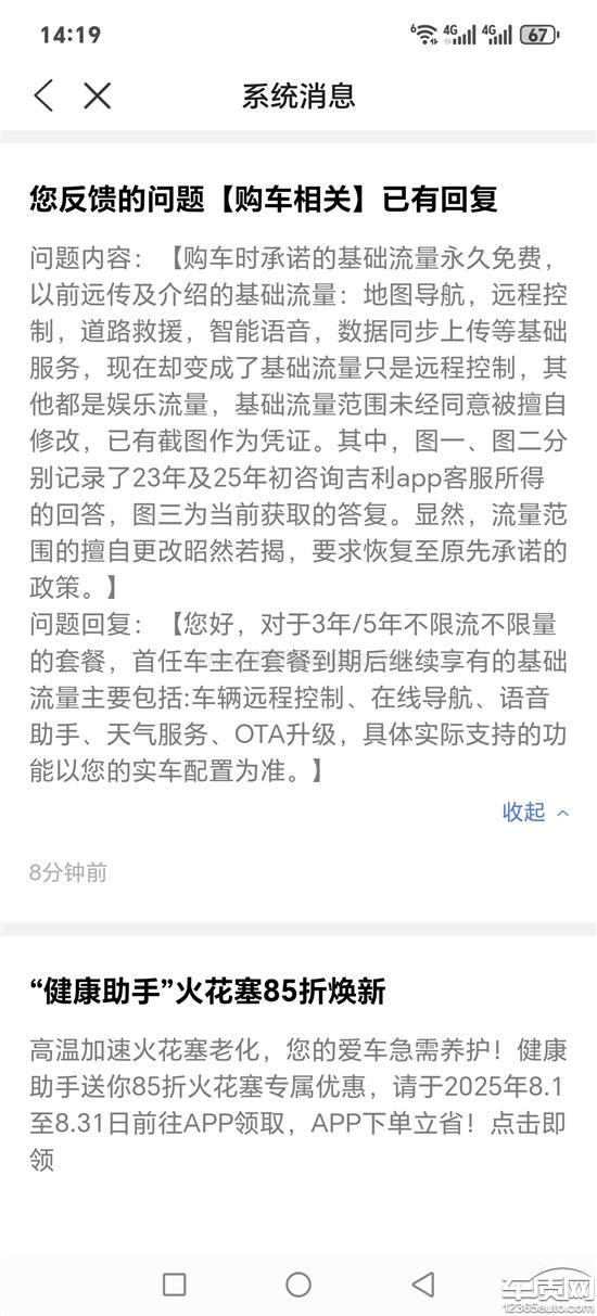 我的23款吉利博越cool购车时,销售人员及其宣传都说的是基础流量包括道路救援(也就是sos),也说了基础流量终身免费,上图有证据可以表明,前几天说的吉利厂家基础流量私自更改,吉利也给了回复,说是销售购车时向用户承诺的权益始终保持一致,不会再更改和减配,上面有图为证,但是你后面又说sos(道路救援)到时需要续费,你这不就是基础流量范围减配么,上图为证,流量范围的事刚解决,你又来个减配,来回搞事,希望吉利厂家能一次性解决关于流量范围这个问题,按照最开始承诺和宣传的那样执行,不要再出尔反尔了!