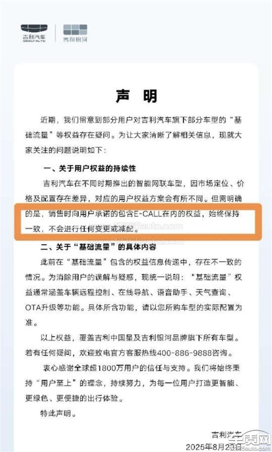 吉利汽车厂家回复:您的信息我们已经收到,感谢您对吉利汽车的信任与支持。吉利汽车在不同时期推出的智能网联车型,因市场定位、价格及配置存在差异,对应的用户权益方案会有所不同。但需明确的是,销售时向用户承诺的包含E-CALL在内的权益,始终保持一致,不会进行任何变更或减配。衷心感谢全球超1800万用户的信任与支持。我们将始终秉持“用户至上”的理念,持续努力,为每一位用户打造更智能、更绿色、更便捷的出行体验。