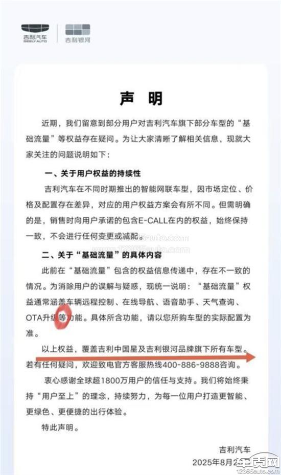 此图片来自网络!如果此图片是吉利汽车官方真实声明的话,那从此次利汽车的声明中,就能看出吉利汽车的吃像有多难看。基础流量中,其他最基本的免流项目都提到了。但为独最重要的SOS(消费者续命的)用(等功能)代替,可以说古利汽车完全不把消费者的生命当回事。买这车的就图个吉利,最后连续命的功能都没有了。当时博越好宣传的都是基础流量终身免费,基础流量包括车机导航,语音交互,远程控制,天气,sOs,并且吉利官方客服电话里明确告知这些都属于基础流量终身免费但吉利官方现在强制要将基础流量拆分,将sos归为娱乐流量,强制让车主在流量到期后续费,这种行为毫无诚信毫无道德毫无底线;