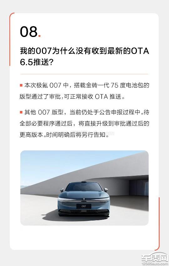 购车时承诺端到端智驾功能会由后续OTA升级提供,2025年8月25日开始推送OS6.5版本系统,提供车位到车位的智驾功能。2025年8月27日发布公告,声称100度电池的007不在此次推送的行列中。