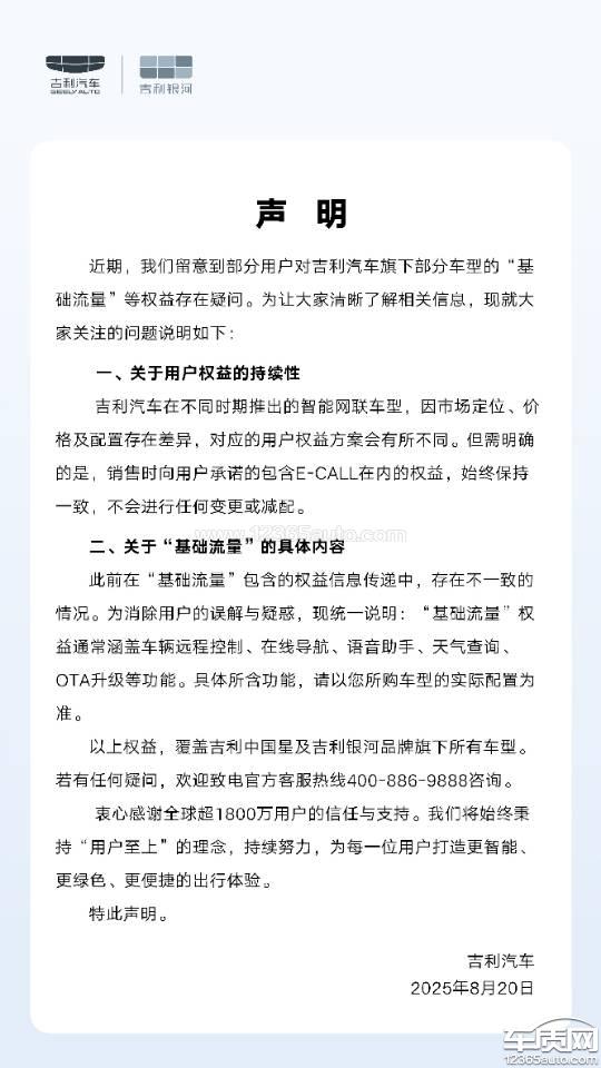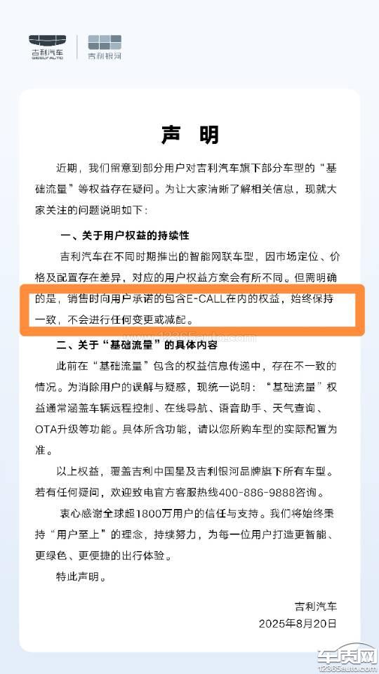8月20号发布声明说E-CALL权益不会篡改,始终保持一致,今日,8月23日,询问官方客服,SOS流量和预科流量一样,到期后需要自行续费,和娱乐流量捆绑销售,SOS功能作为事故后紧急联系救援的一个安全方面的功能,却还要流量捆绑销售这是在拿广大的吉利车主们的生命安全在开玩笑,私自篡改流量权益内容,还我们一个正常权益! 另外现在厂家回复的驴头不对马嘴的,只说基础流量通常包含哪些内容,含糊不清,不去正面回应SOS已经ecall流量这些问题,并且联系给4s店释压联系车主让删帖子,抖音还删评论。
