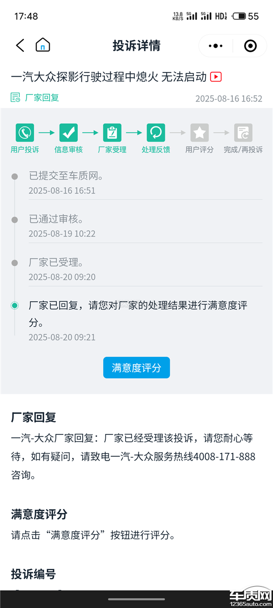 一汽-大众厂家回复:厂家已经受理该投诉,请您耐心等待,如有疑问,请致电一汽-大众客户关怀热线4008-171-888咨询。