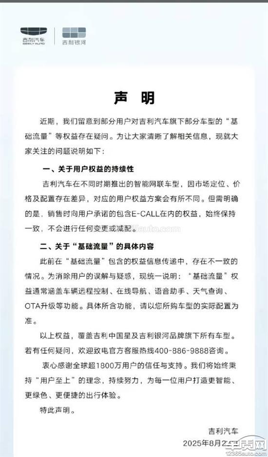 吉利汽车厂家回复:您的信息我们已经收到,感谢您对吉利汽车的信任与支持。吉利汽车在不同时期推出的智能网联车型,因市场定位、价格及配置存在差异,对应的用户权益方案会有所不同。但需明确的是,销售时向用户承诺的包含E-CALL在内的权益,始终保持一致,不会进行任何变更或减配。衷心感谢全球超1800万用户的信任与支持。我们将始终秉持“用户至上”的理念,持续努力,为每一位用户打造更智能、更绿色、更便捷的出行体验。