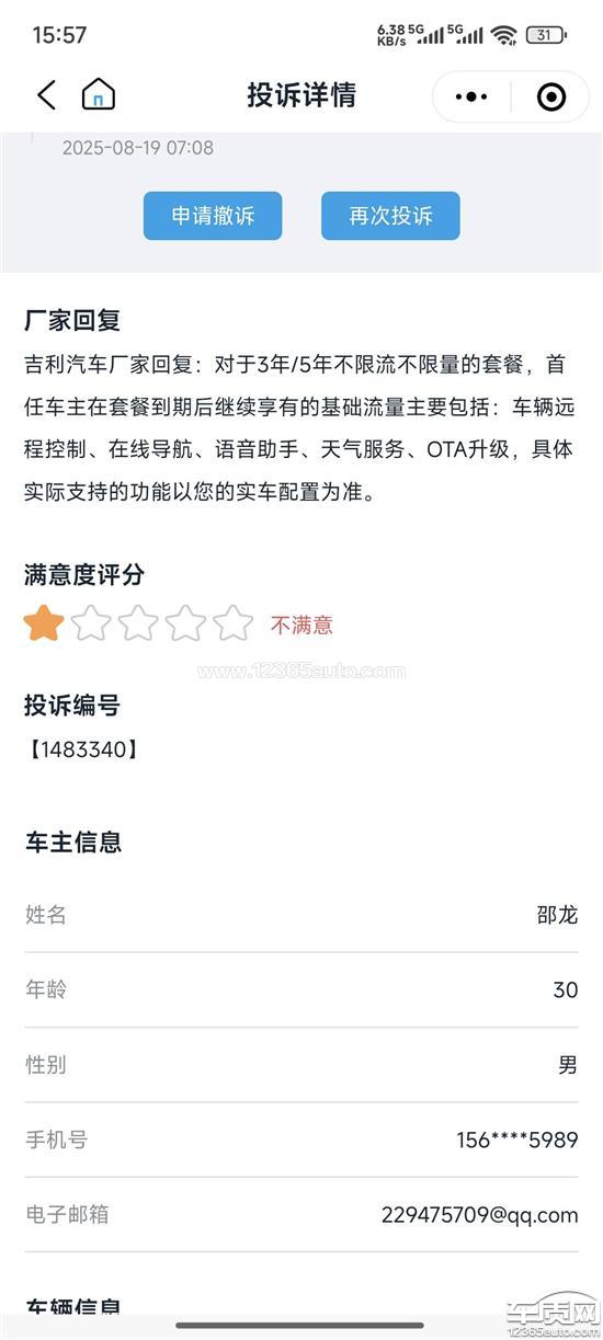 我于2025年4月17日购买吉利汽车博越L车型,4月18日激活车辆。该车官方承诺提供三年免费流量,按正常情况应于2028年4月17日到期,但我实际查询后发现,免费流量已于2025年3月31日到期。厂家承诺不兑现,恶意克扣车主权益,给我造成了经济损失,投诉后厂家回复驴唇不对马嘴。同时9月1号出现尾灯贯穿灯内部起雾问题。