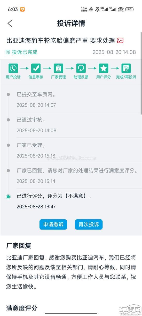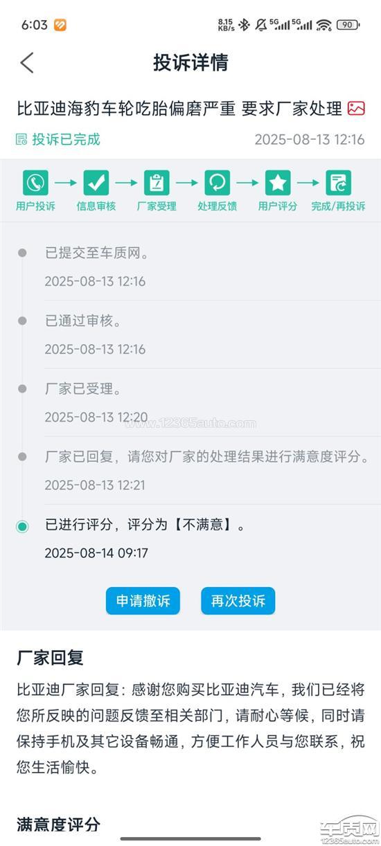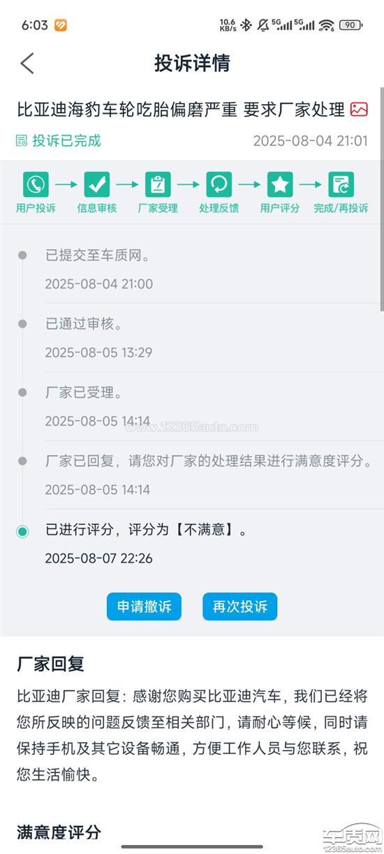 本人近期投诉比亚迪三次,问题为:车辆购买没满2年,刚行驶43000km,车胎磨损严重(内侧边缘只剩2.6mm)。车辆设计问题,非司机驾驶习惯导致。行驶记录里面有每次的行驶记录,很少急加速及急刹车。换胎成本不应该消费者承担,要求比亚迪厂家予以解决:1.免费更换轮胎;2.彻底修复偏磨问题;3.书面道歉。证据已同步提交至12315平台。解决人员不与投诉人联系直接在程序上办结,消极怠工,要求惩处。