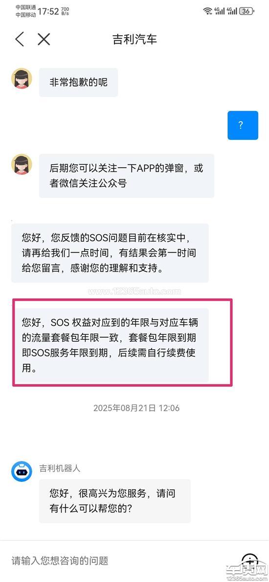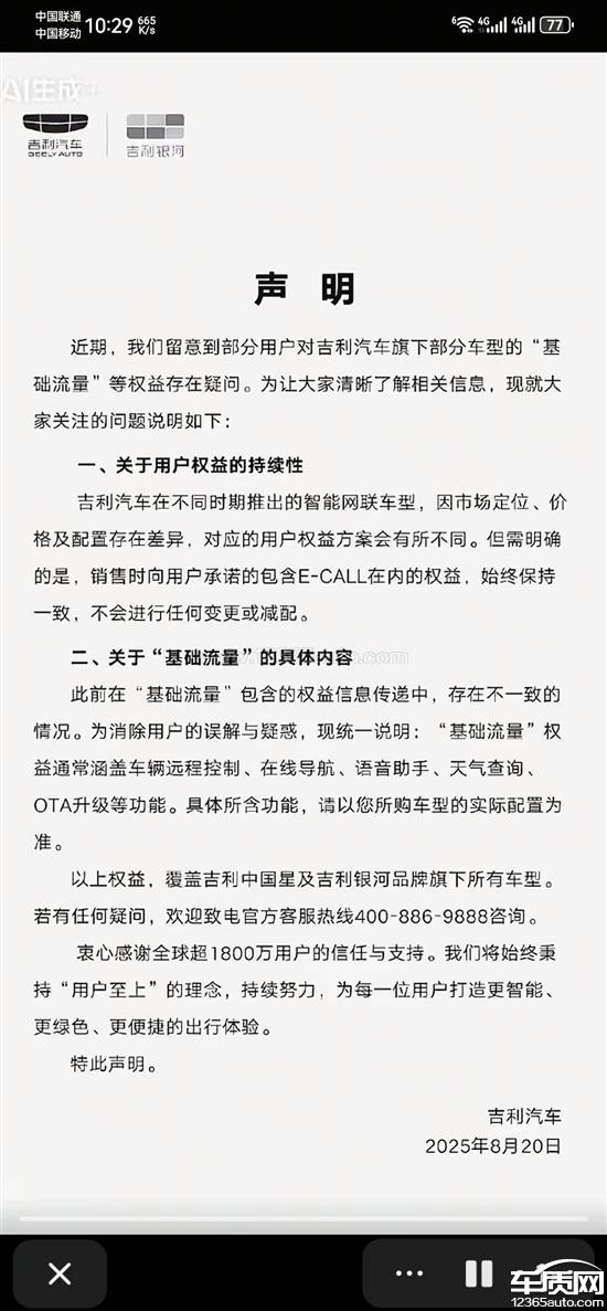 吉利汽车厂家回复:您的信息我们已经收到,感谢您对吉利汽车的信任与支持。吉利汽车在不同时期推出的智能网联车型,因市场定位、价格及配置存在差异,对应的用户权益方案会有所不同。但需明确的是,销售时向用户承诺的包含E-CALL在内的权益,始终保持一致,不会进行任何变更或减配。衷心感谢全球超1800万用户的信任与支持。我们将始终秉持“用户至上”的理念,持续努力,为每一位用户打造更智能、更绿色、更便捷的出行体验。