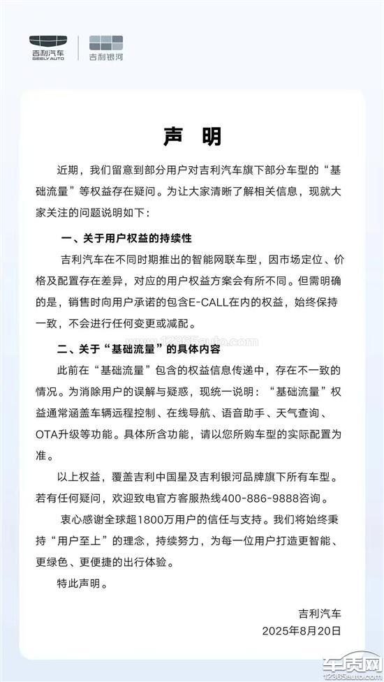 吉利汽车厂家回复:您的信息我们已经收到,感谢您对吉利汽车的信任与支持。吉利汽车在不同时期推出的智能网联车型,因市场定位、价格及配置存在差异,对应的用户权益方案会有所不同。但需明确的是,销售时向用户承诺的包含E-CALL在内的权益,始终保持一致,不会进行任何变更或减配。衷心感谢全球超1800万用户的信任与支持。我们将始终秉持“用户至上”的理念,持续努力,为每一位用户打造更智能、更绿色、更便捷的出行体验。