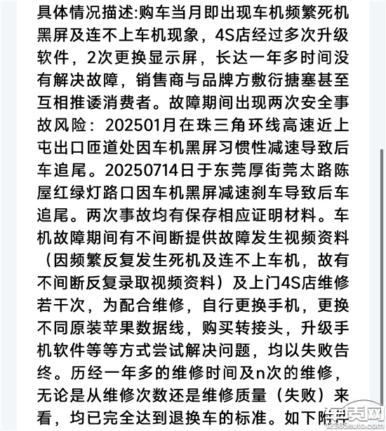 具体情况描述购车当月即出现车机频繁死机黑屏及连不上车机现象,4S店经过多次升级软件,2次更换显示屏,长达一年多时间没有解决故障,销售商与品牌方敷衍搪塞甚至互相推诿消费者。故障期间出现两次安全事故风险:202501月在珠三角环线高速近上屯出口匝道处因车机黑屏习惯性减速导致后车追尾。20250714日于东莞厚街莞太路陈屋红绿灯路口因车机黑屏减速刹车导致后车追尾。两次事故均有保存相应证明材料。车机故障期间有不间断提供故障发生视频资料(因频繁反复发生死机及连不上车机,故有不间断反复录取视频资料)及上门4S店维修若干次,为配合维修,自行更换手机,更换不同原装苹果数据线,购买转接头,升级手机软件等等方式尝试解决问题,均以失败告终。历经一年多的维修时间及n次的维修,无论是从维修次数还是维修质量(失败)来看,均已完全达到退换车的标准。如下附件。