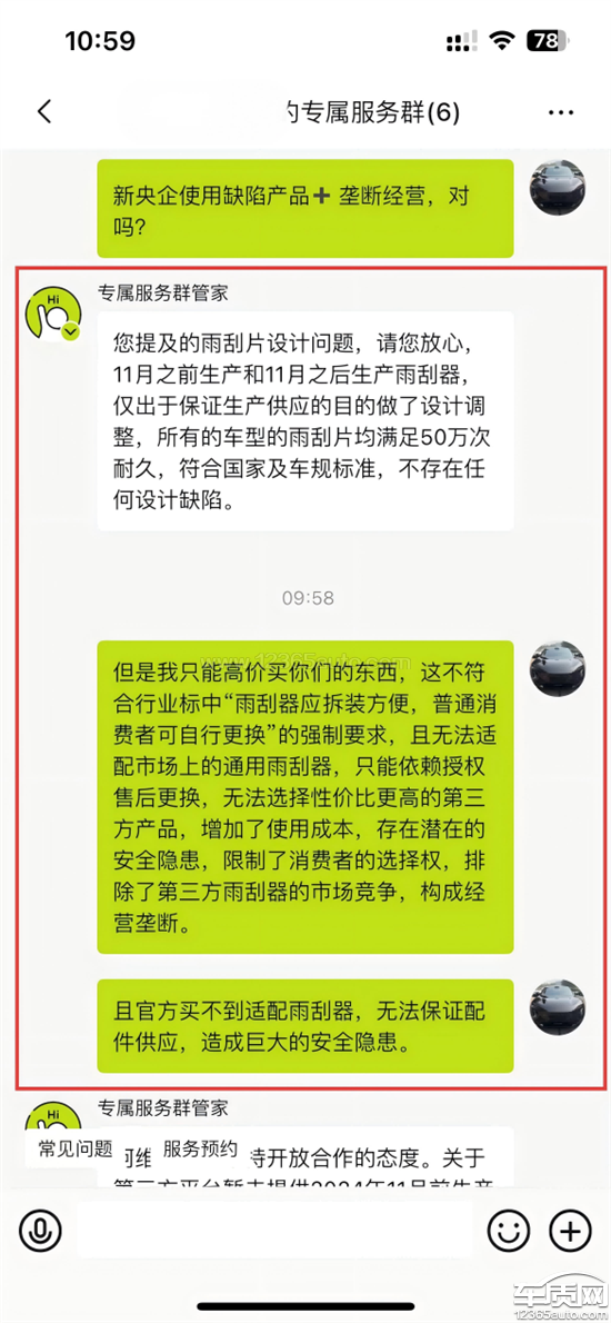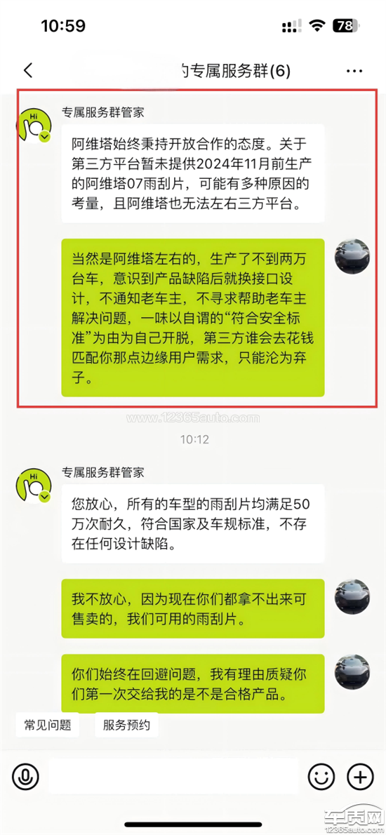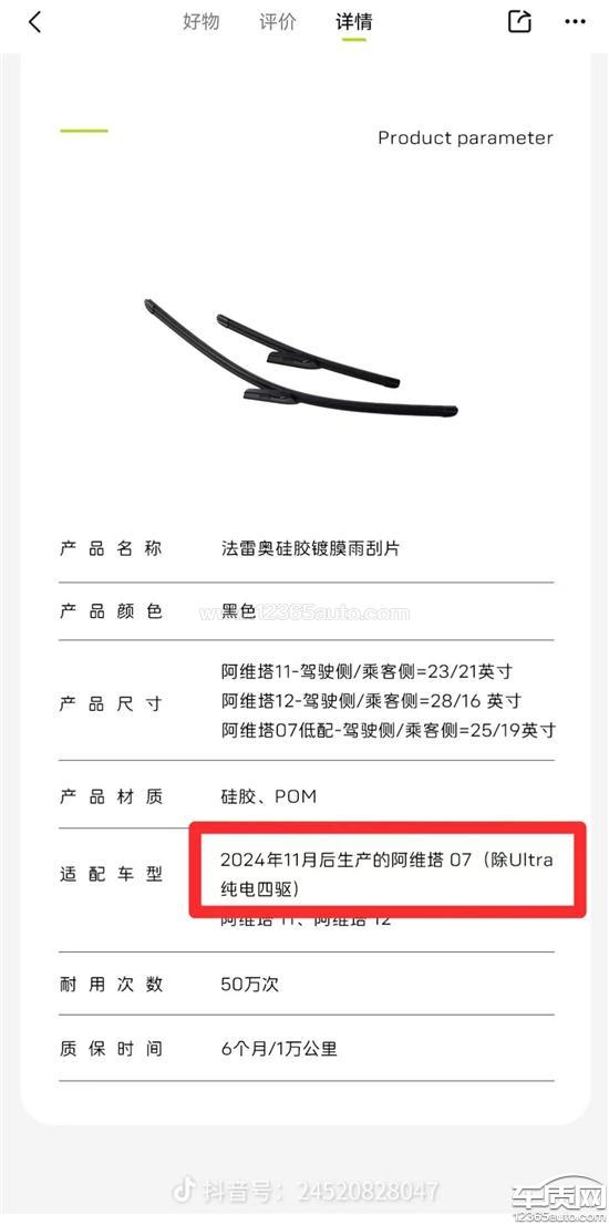 我的车辆阿维塔07购买于2024年9月底,近期我自己和其他首批车友发现阿维塔07车型2024年11月之前生产交付的车辆和之后生产的车使用了不同的雨刮器设计,11月份之前生产的车辆雨刮器采用了专有双卡扣接口,该接口设计复杂,不符合行业标准中“雨刮器应拆装方便,普通消费者可自行更换”的强制要求,且无法适配市面上的通用雨刮器,导致早期车型的雨刮片在第三方市场完全断供。甚至连官方也无法保障特殊雨刮片的供应,影响正常更换。而2024年11月后生产的同车型已偷偷更换为市面通用接口,厂家设计变更未告知早期车主,且未提供替代方案,侵犯了消费者的知情权和选择权,剥夺了消费者选择第三方配件的权利,构成对公平交易权的侵害。这使得首批车主只能依赖授权售后更换雨刮器,无法选择性价比更高的第三方产品,增加了使用成本。这种情况已经造成的重大的安全隐患,雨刮器是影响雨天行车安全的关键部件,缺陷直接危及驾驶安全,甚至可能会造成巨大的交通事故和经济损失。且车辆在上市不到2个月的上市初期,突然偷偷对雨刮器进行设计变更,可以认定为阿维塔默认首批车型的雨刮器存在设计缺陷和安全隐患,所以才偷偷变更了雨刮器设计,但并没有告知前批次车主,属于故意隐瞒缺陷行为,属于欺骗消费者行为。并且我在和阿维塔官方沟通的过程中,阿维塔仅仅强调“如果您需要更换雨刮片,建议通过官方渠道订购原厂备件,以保障车辆的最佳使用状态。”“11月之前生产的07车型所适配的镀膜雨刮片,目前在研发验证阶段,预计在今年11月左右上架商城,届时会覆盖到所有阿维塔车型,确保每位车主都能用上原厂品质的镀膜雨刮片。”从这些话中可以认为阿维塔首批车主的雨刮器是没有经过充分验证的缺陷产品,不然为什么现在还需要验证,直接生产不就行了?而且只能用原厂品质的雨刮片,充分标明阿维塔违反了反垄断法,限制了消费者的选择,排除了第三方雨刮器市场的竞争,构成了经营者与交易相对人之间的垄断协议。鉴于该缺陷涉及行车安全,且厂家未能提供有效解决方案,诉求如下:1、依法对阿维塔07车型雨刮器缺陷展开调查,并启动缺陷产品召回程序。2、督促厂家立即采取有效措施(例如:免费为早期车型更换为通用型雨刮臂及接头),以消除安全隐患。3、要求厂家就设计缺陷及未履行告知义务的问题公开说明并致歉。4、在召回实施前,督促厂家确保适配早期车型的特殊雨刮片供应。