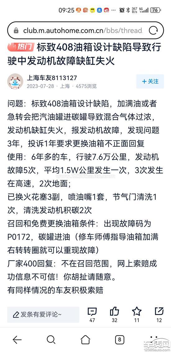 本人2017年6月买了一台16款1.6T豪华版408,平时都用原厂机油按时保养,目前有个严重问题(之前几年也出现过多次,最近特别频繁):发现车辆加满油右转弯时,发动机转速突然增大,车载屏幕弹出发动机异常,请维修车辆的警告,车子加速无力,发动机抖动熄火,油箱内油量少时就不会出现异常,特别是加油后,每次高架路40~50码转弯,必定出现上述异常(本人2025年9月20日已经去无锡神龙汽车4S店检查维修,并且和维修工程师一起试车,现场试出上述异常,油表指针忽上忽下,车辆无动力,在高速上匝道也出现过,并且发生车祸剐蹭,质量有严重的问题!)试完车回店检查,读车辆故障码,显示发动机缸内缺火,工程师开始检查缺火原因:火花塞(本人刚刚换的新的)、点火线圈、都是好的,碳罐有汽油,用气枪给我吹出,说也是好的,本人平时用车爱惜,车子也不烧机油,目前问题未解决,4S答复说再检查要收费,并且不一定能找到原因。本人网上查询过,这个批次的汽车油箱有设计缺陷,有部分车主召回更换过,目前本人和维修师傅现在严重怀疑这个油箱有缺陷问题,并且汽车之家论坛上有车主和我一模一样的问题,都是通过索赔更换汽车油箱解决的,我希望4s和厂家能帮我免费更换油箱,及时解决问题,保障标致车主权益。