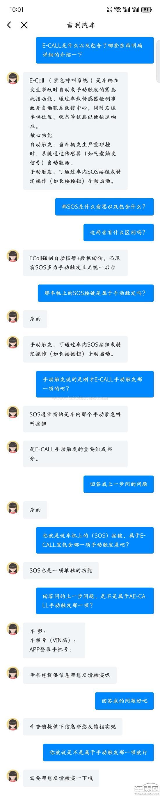 吉利汽车销售明确说明(紧急救援)E-CALL终身免费,而且吉利官方客服也明说ecall就是SOS,因为是一样的触发方式,现在SOS成3年之后到期续费了!为啥一样的触发方式,都是一样东西叫两个名,一个免费,另一个又要收费,而且买车时间与问车不足三个月!你也不用拿时间来说事,本来SOS就是免费的事,到你这成娱乐流量了,那我是不是也可以理解没事按下SOS玩玩啊?你把上一个车主网的投诉信息回复完全就是为了把车质网投诉排行榜的排名降下去而已!你要是一直这么做我就就一直投诉!还有在提车时销售并没有说SOS成娱乐流量,还有吉利你发声明就发了屁啊!毛用都不管!你自己都搞不清楚还回复呢!你这是词穷了吧!