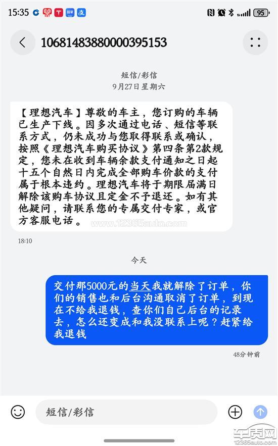 销售口口声声说的订单已经取消,没有给我生产车辆却要扣下我的钱不退,这么大的企业靠着霸王条款骗取顾客所谓定金维持吗?现在距离我当时付5000元已经过去20天了,上周六也就是9月27突然给我发来车辆已经下生产线了,我就想问,销售都已经明确的和后台沟通取消的订单,怎么就下生产线了,为了把我这5000落袋为安,还学会撒谎啦?本来想着法治社会这简单的问题一定能合理的解决,没想到还是店大欺客想怎么弄就怎么弄,短信里还声称多次和我联系没联系上,我只在交付5000元当天接到过所谓交付中心工作人员的电话,我当时就明确告知取消了,她们和销售也有过沟通,怎么就下生产线了?是不是很莫名其妙。