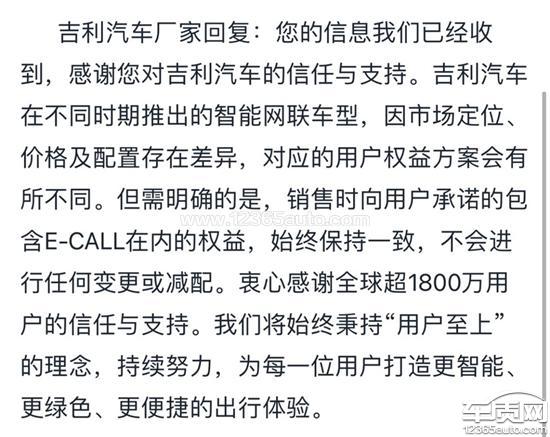 吉利汽车厂家回复:您的信息我们已经收到,感谢您对吉利汽车的信任与支持。吉利汽车在不同时期推出的智能网联车型,因市场定位、价格及配置存在差异,对应的用户权益方案会有所不同。但需明确的是,销售时向用户承诺的包含E-CALL在内的权益,始终保持一致,不会进行任何变更或减配。衷心感谢全球超1800万用户的信任与支持。我们将始终秉持“用户至上”的理念,持续努力,为每一位用户打造更智能、更绿色、更便捷的出行体验。