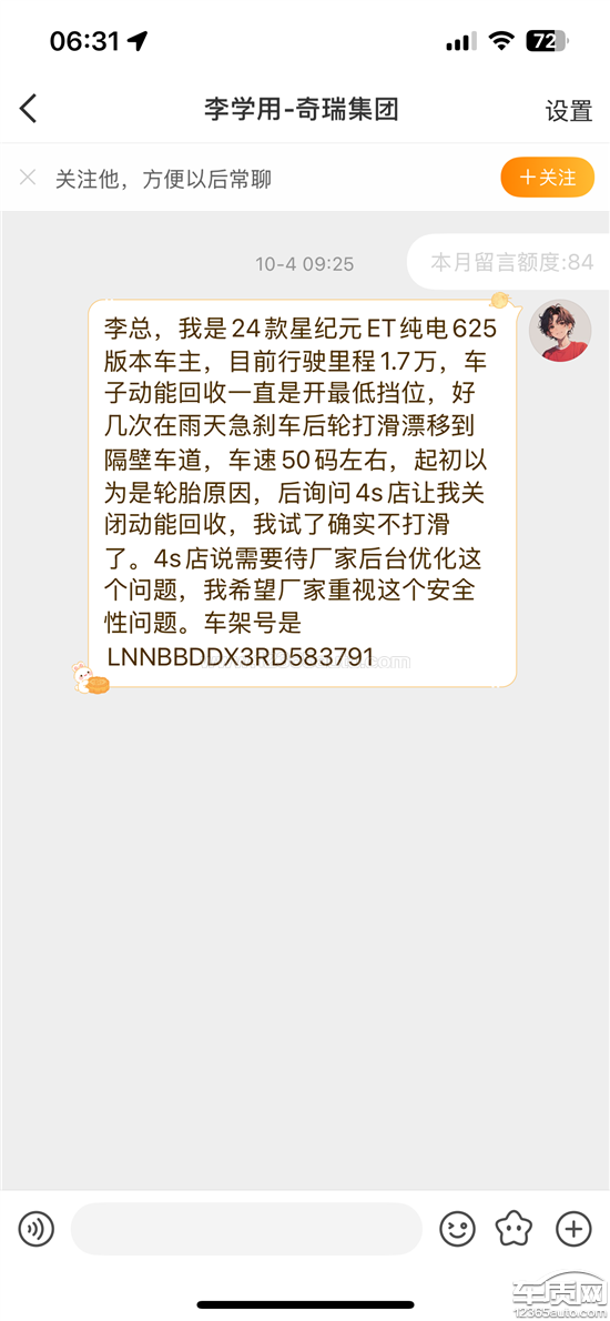 我是24款星纪元ET纯电625版本车主,目前行驶里程1.7万,车子动能回收一直是开最低挡位,好几次在雨天急刹车后轮打滑漂移到隔壁车道,车速50码左右,起初以为是轮胎原因,后询问4s店让我关闭动能回收,我试了确实不打滑了。4s店说需要待厂家后台优化这个问题,我希望厂家重视这个安全性问题。还有后空气悬挂有异响。