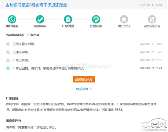 2025年9月11日,我在平台投诉,厂家只是在投诉回复一句我们跟进持续关注的固定模板,在无其他任何信息!!!!一个月时间对这个问题不管不问,甚至连个致电都没有!2025年7月20日我去店里的时候,他们店里已经有在途的车要到店,和我要的配置一样,这个车不管我买还是不买他都会到店!但是销售却还是让我交定金,而且是分两笔,线下两千,线上1000。说是只有这样才可以享受权益。现在我车不要啦,车也没有退款渠道,分明就是霸王条款啊!我在银河APP上交了1000定金,我交不交这1000他车的配置都是这样,却还是诱导我线上支付1000,支付记录我都有,这不就是霸王条款,由于资金问题,我说车不要了,他直接把车卖给了别人,定金却还是不退!而且这都已经快两个月了,我要求退定金。