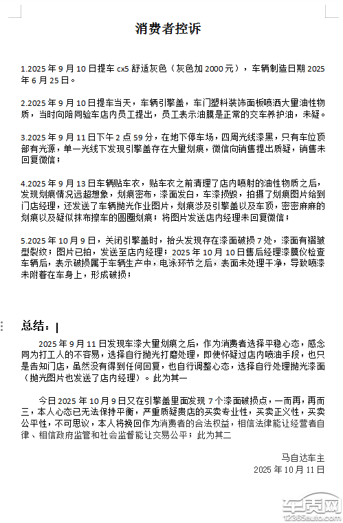 2025年9月10日提车,车身遍布表板蜡,9月11日发现漆面有划痕,蜡油掩盖,10月9日发现引擎盖7处爆漆。