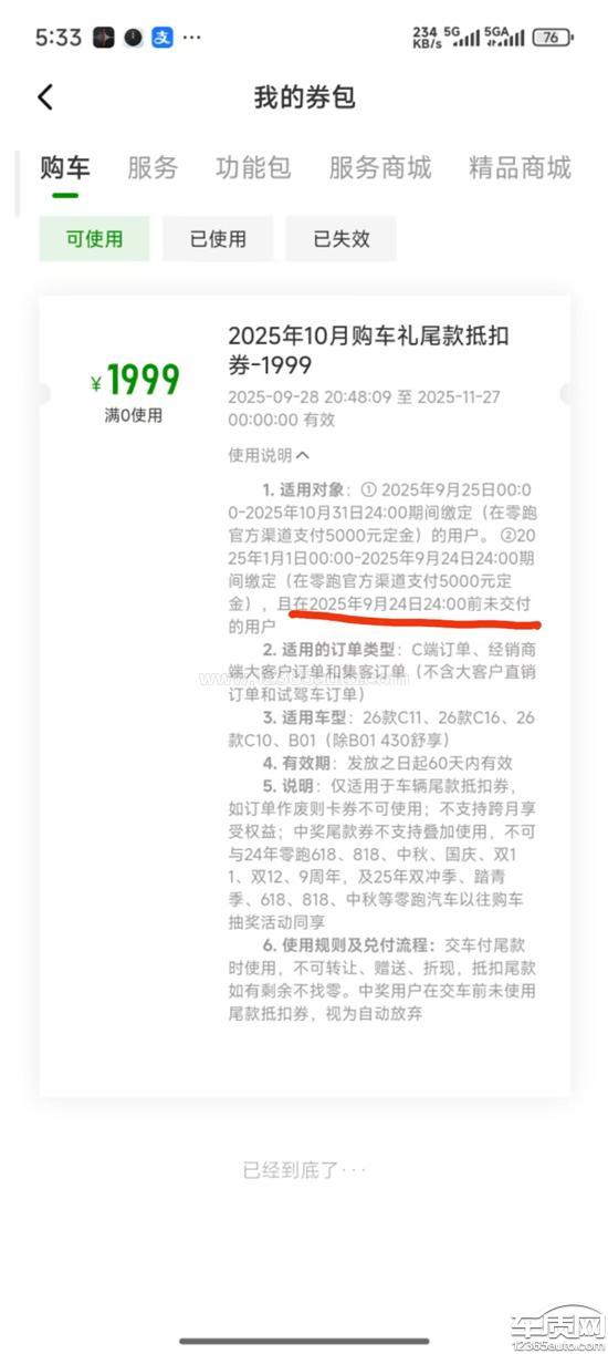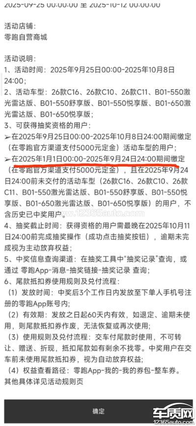 本人于2025年9月22日通过零跑汽车官方APP预定B01650激光雷达版车辆,9月28日等待生产期间,经官方APP推送参与《百万零跑越来越好》抽奖活动,中奖1张1999元尾款抵扣券,且本人订单在活动有效期内、未提车,完全符合活动细则要求。10月8日提车时,销售方却拒绝使用该优惠券,虽联系官方400客服得知活动成本由厂家承担,但销售方仍不让使用,需要减少原优惠政策才可以使用;此外,现要求零跑汽车品牌履行承诺,允许使用尾款优惠券并减免费用,同时按宣传广告约定赔偿车辆未如期交付的补偿积分。