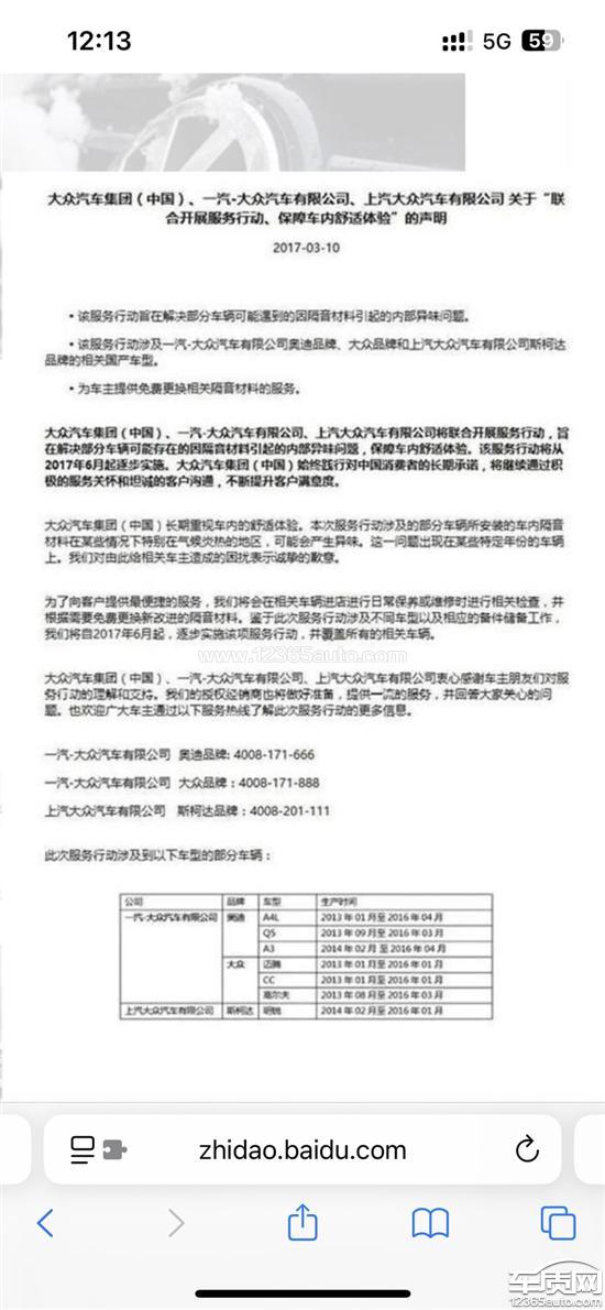 本人所购车辆为2016年3月出厂的大众高尔夫车型,因隔音棉质量问题导致车内存在异味,长时间吸入身体会出现不适,后得知该款车型存在质量缺陷,大众官方曾在2017年发布过召回计划,经确认,本人车型及生产日期均符合条件。后联系大众官方客服,客服表示该召回计划已经结束,需要本人前往4s店确认。本人联系4s店后,4s店又表示本人的车辆不在召回计划范围内,本人表示不认可。理由如下:一、本人车辆的车型是大众高尔夫,出厂日期为2016年3月18日,按照召回公告应在召回计划范围内;二、官方召回计划的内容中并未提及结束时间,大众单方面结束该计划的行为不合理。本人诉求:一、更换质量达标且无异味的隔音棉,并清洗因“黑心棉”导致被异味侵染的空调系统和内饰等部件,恢复驾驶室内清新无异味;二、因未及时通知更换给予本人健康补偿。